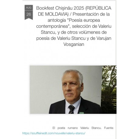 El jueves 4 de septiembre, a partir de las 12.30 h., se presentarán la antología"Poésie européenne contemporaine" y el volumen de poesía"Ceremonia risipirii" (La cérémonie de la dissipation) de Valeriu Stancu.